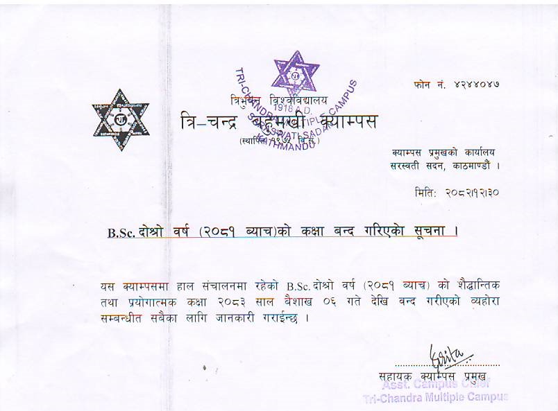 B.Sc. दोश्रो वर्ष २०८१ ब्याच को कक्षा बन्द गरिएको सूचना ।