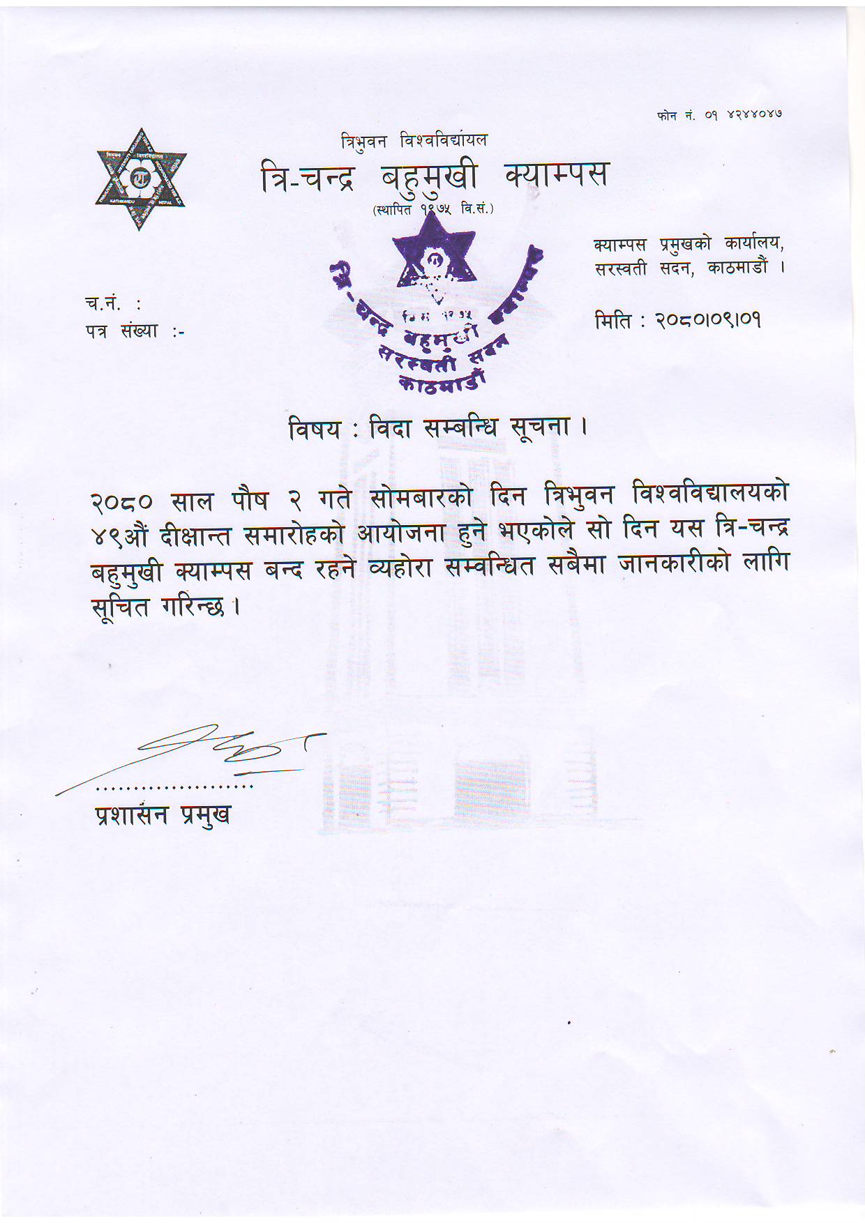 वि.ए. तेश्रो वर्षको भर्ना सम्बन्धी सूचना ।
