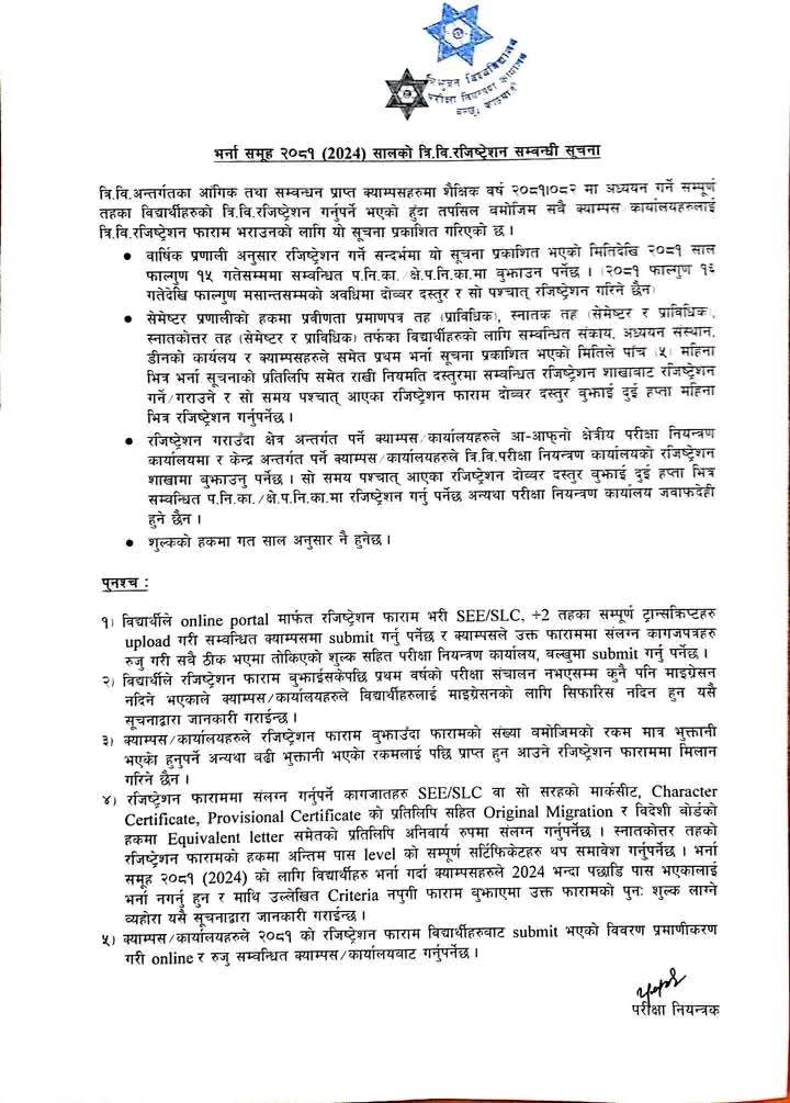 भर्ना समूह 2081 को T.U. Registration सम्बन्धी सूचना ।