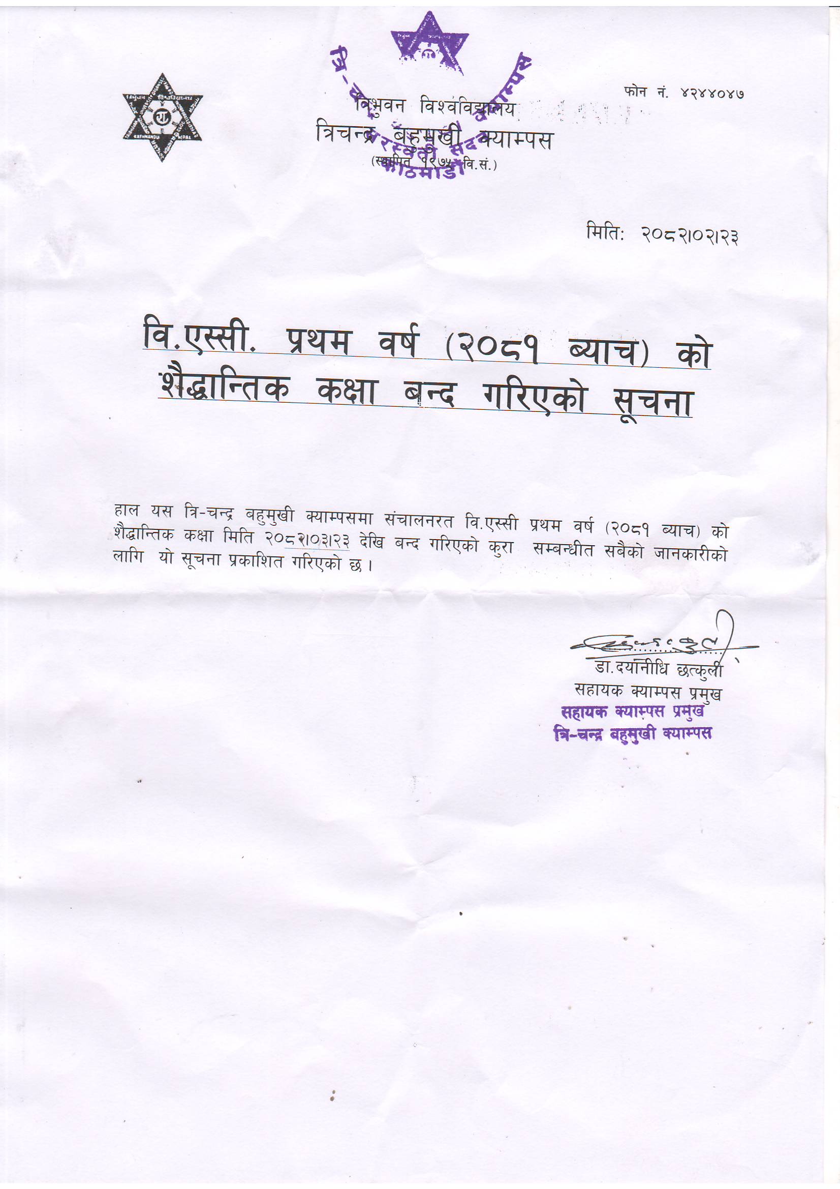 वि एस्सी प्रथम वर्ष 2081 व्याच को शैदान्तिक कक्षा बन्द गरिएको सूचना ।